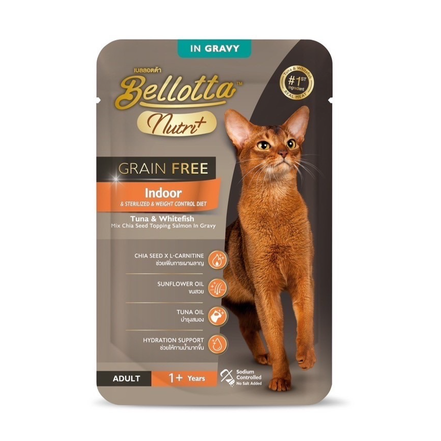 (โหล) 12x70ก. Bellotta Nutri+ Grain Free เพาซ์แมว สูตรIndoor, Sterilised, Weight Control รสทูน่าปลาเนื้อขาวเจียแซลมอนเกรวี่